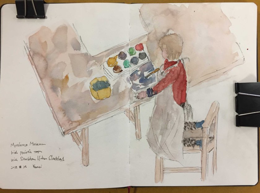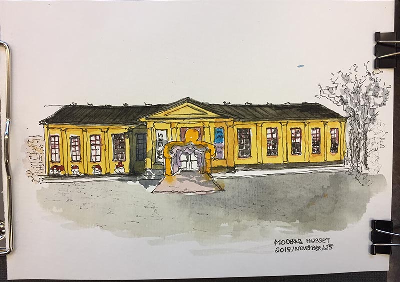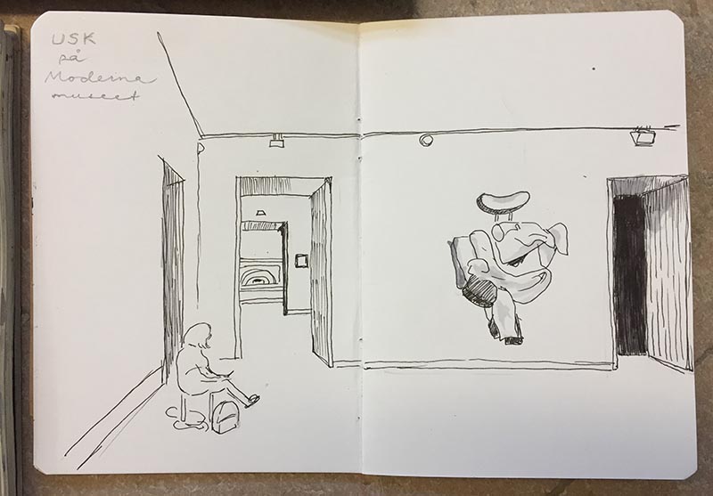 Sista söndagen i november träffades Stockholms Urban sketchers på Moderna museet för en sista tecknarträff innan nyår. Vädret utomhus i november utgör rätt motiga förutsättningar för tecknande, så Modernas stora upplysta salar kändes lockande. Vi ägnade oss åt museets samlingar, där det finns mycket att teckna, både rum, konstverk och människor.