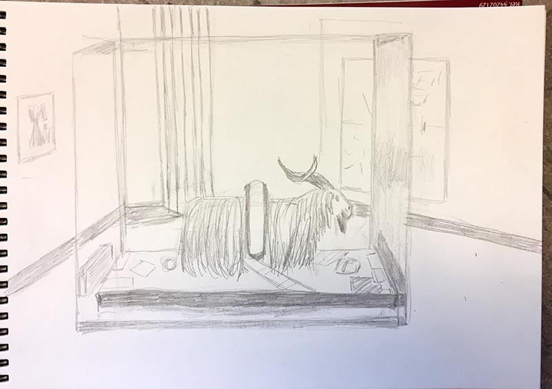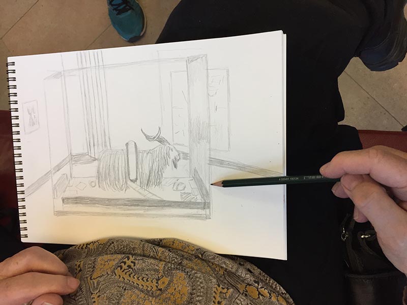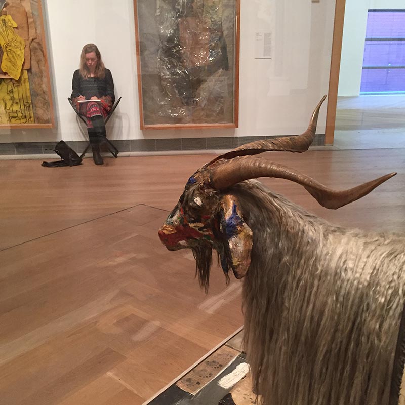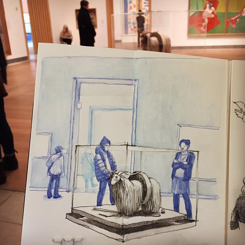 Rauschenbergs Monogram (eller ”geten” som vi lite vårdslöst tenderar att kalla den) hamnade i fokus i en hel del skisser. Dels är den ett intressant motiv i sig, men det är också roligt att iaktta hur besökare interagerar med den. Många fotar den med telefonen, står kvar en stund, pratar lågmält med någon i sällskapet, går iväg en stund och kommer tillbaka – väldigt tacksamma situationer för en tecknare.