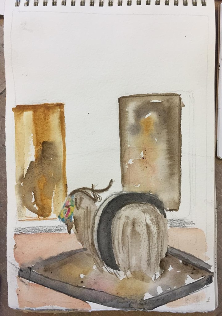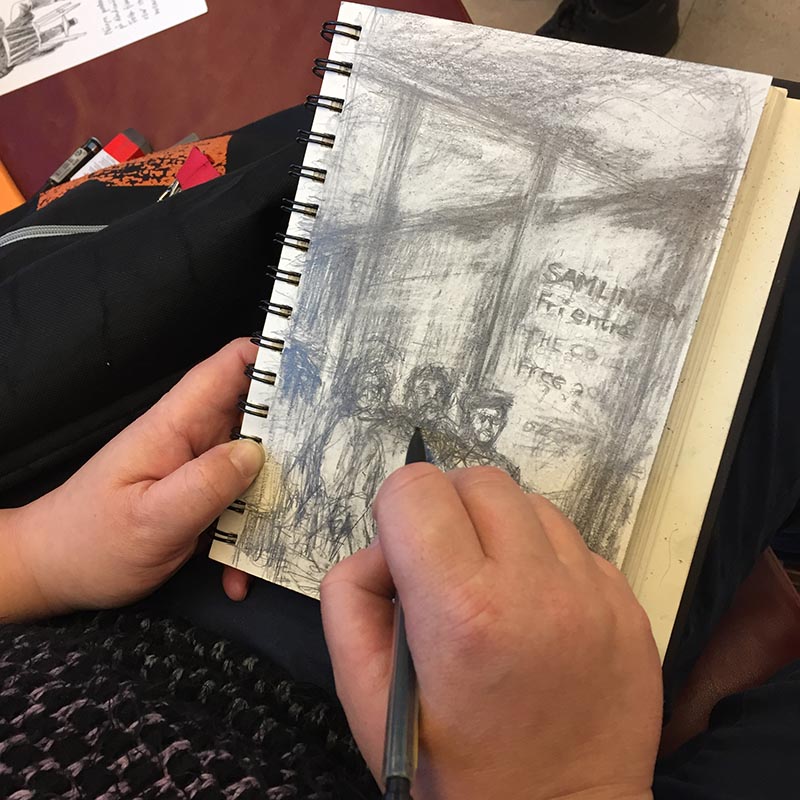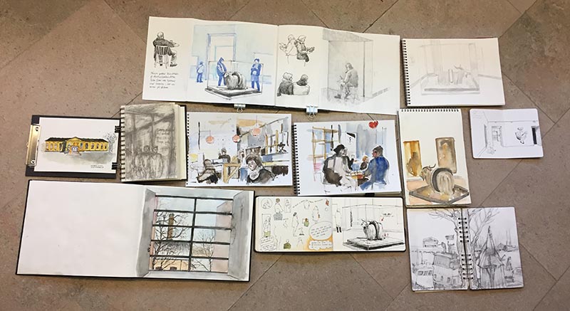 Efter ungefär två timmar samlades vi, som vi brukar när vi ses, för att titta vad alla gjort. Det här är nästan det roligaste momentet, det är verkligen en ynnest att få ta en titt i andras skissböcker och ritblock!