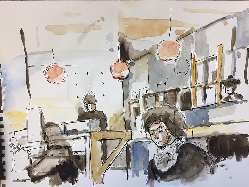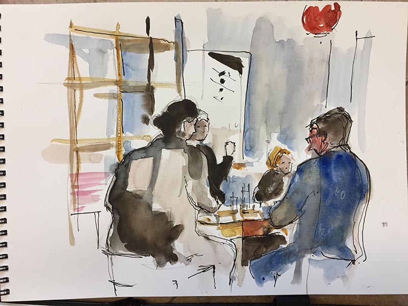 Det roliga som alltid slår en när urban sketchers samlas och skissar tillsammans är hur olika vi ser på vår omgivning, hur vi intresserar oss för olika typer av motiv, fastän vi sitter på en och samma plats och skissar.
