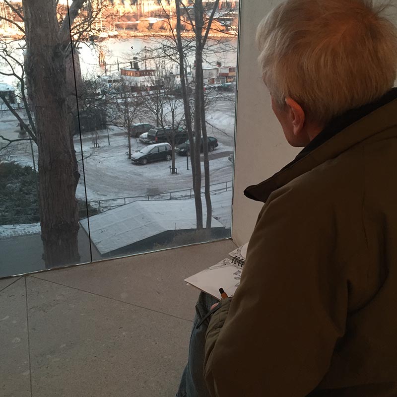 Medan vissa av oss tecknade det som försiggick i museets salar, valde andra att ägna sig åt den härliga utsikten som Moderna museets ljusinsläpp här och där bjuder på.