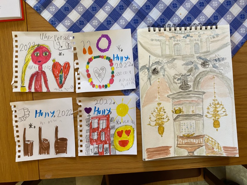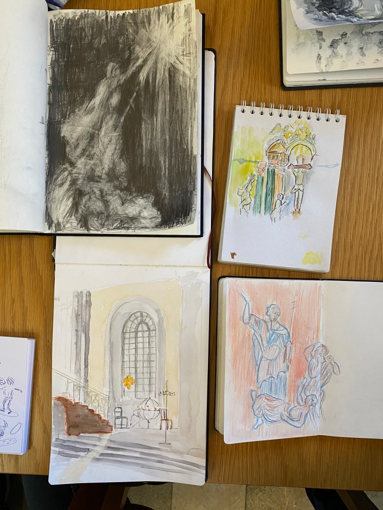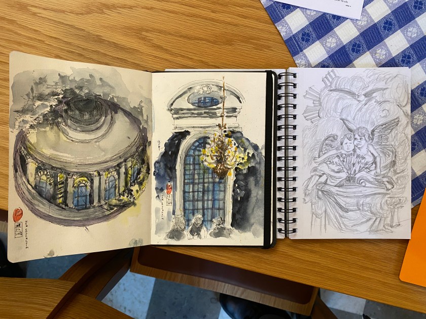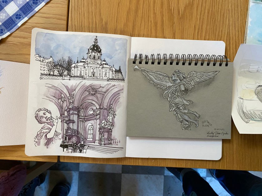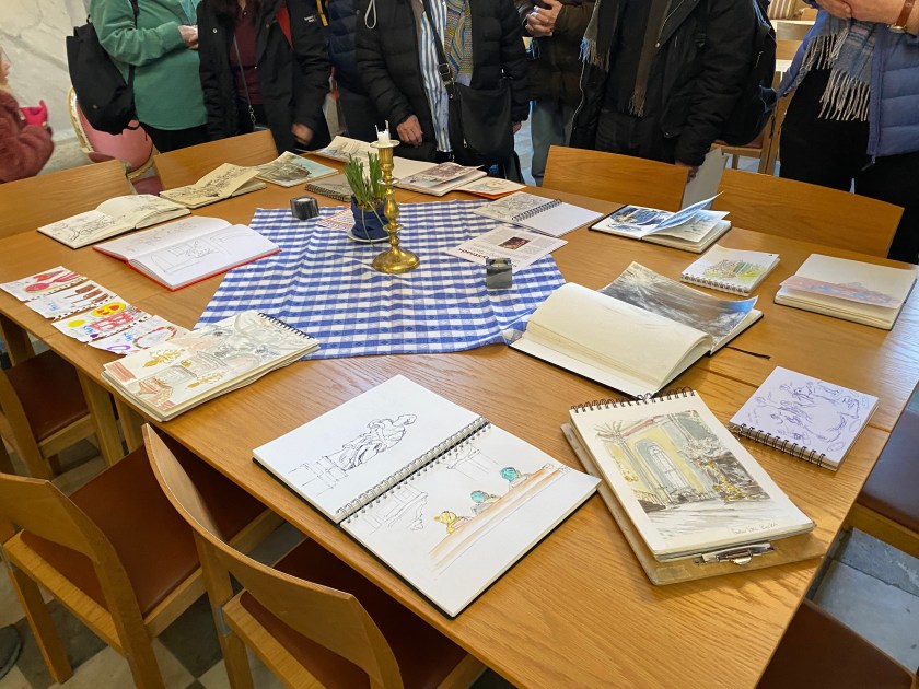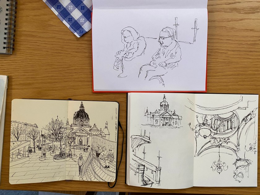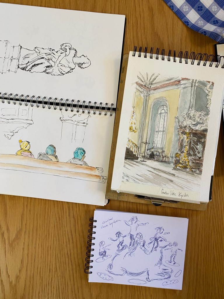 Sista söndagen i februari 2022 träffades vi och tecknade i Gustaf Vasa kyrka vid Odenplan. Vacker byggnad, trevlig stämning, kluriga perspektiv, och väldigt gott om motiv att välja bland.