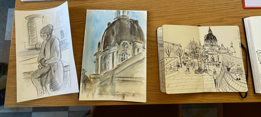 Under coronatiden har Urban sketchers Stockholm mestadels tecknat hemma på våra kammare, med lite utmaning i olika teman varje månad. Men nu verkar coronan ge vika något (och vi håller tummarna för att det fortsätter så!) och vi kan ses och teckna tillsammans igen. Härligt! Det är ju det urban sketching går ut på – att teckna på plats, gärna tillsammans med andra likasinnade.