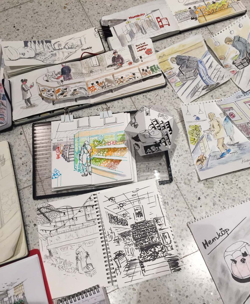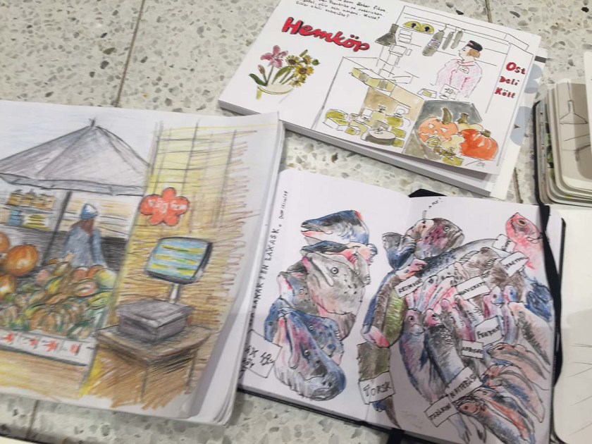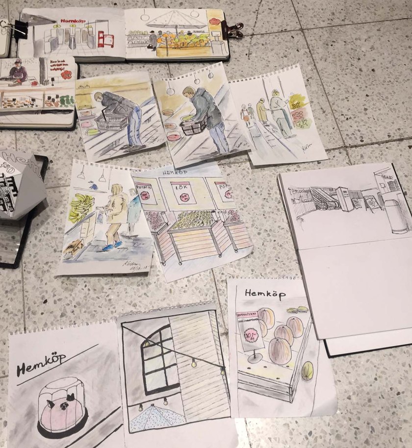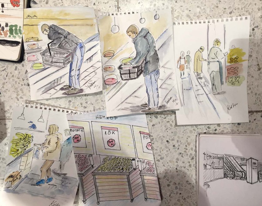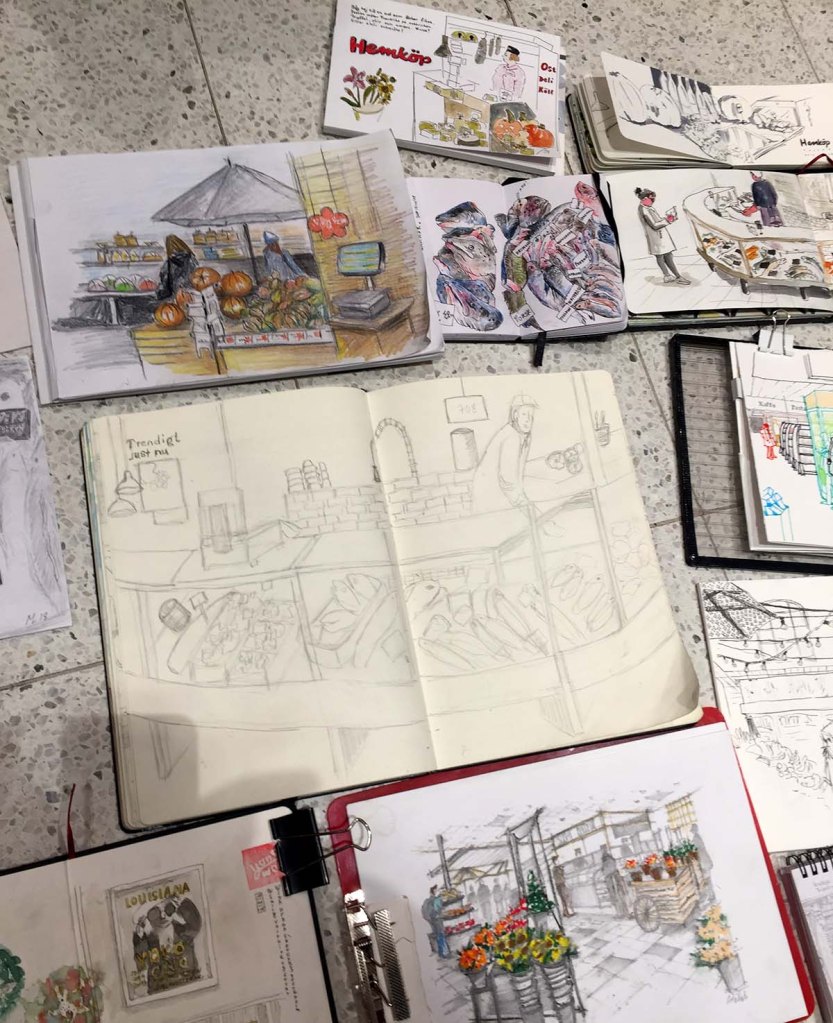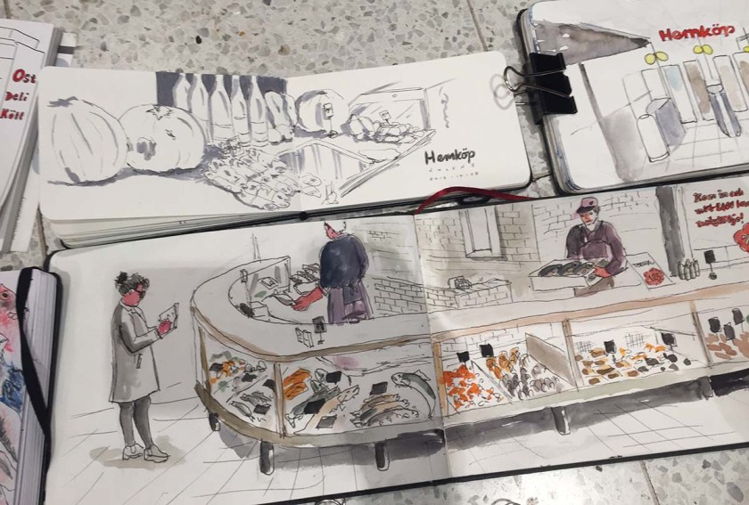I slutet av varje skisstillfälle brukar vi lägga ut alla skissböcker och ritblock på golvet för att beskåda dagens arbete, ett härligt tillfälle att se bredden och möjligheterna till olika uttryck och tekniker, och skisserna från Hemköp var inget undantag. Det var en fröjd för ögat att se allas bilder! Så skiftande, och så mycket händelser skildrade, det här var en dag där alla mestadels hade ritat verb på teckningarna, inte bara substantiv. Folk som plockar varor, provar ost, handlar fisk – allt blev fångat på papper.