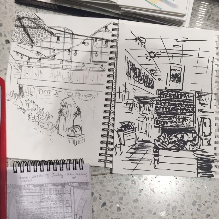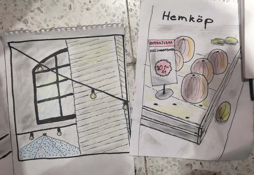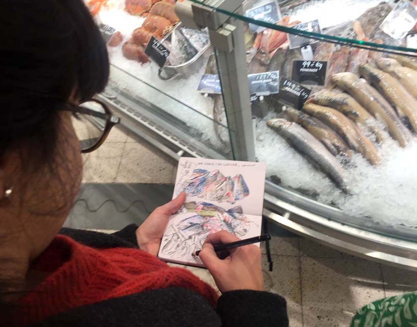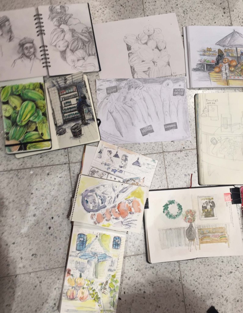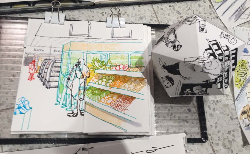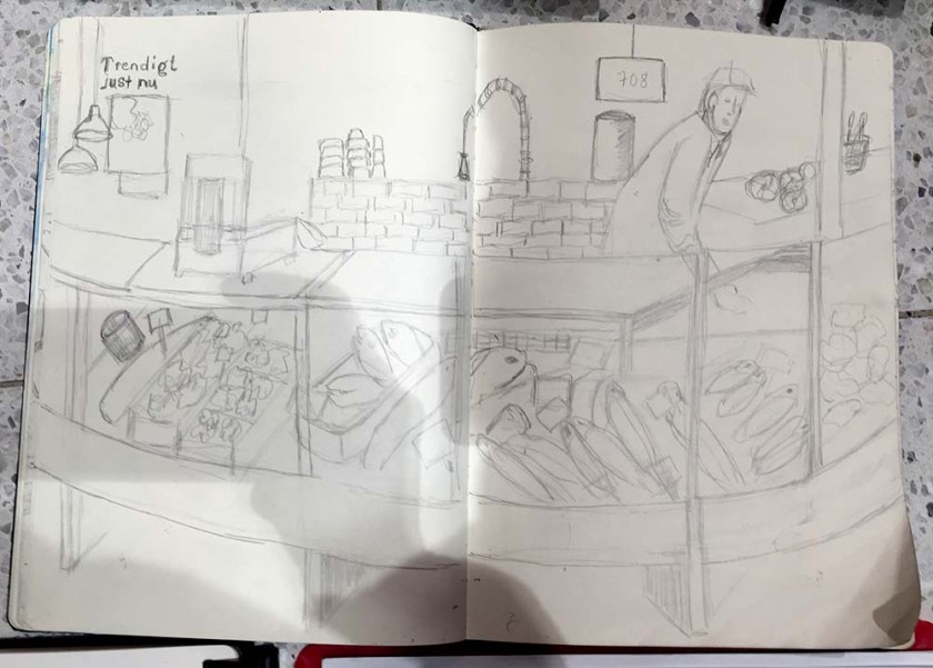 I slutet av varje skisstillfälle brukar vi lägga ut alla skissböcker och ritblock på golvet för att beskåda dagens arbete, ett härligt tillfälle att se bredden och möjligheterna till olika uttryck och tekniker, och skisserna från Hemköp var inget undantag. Det var en fröjd för ögat att se allas bilder! Så skiftande, och så mycket händelser skildrade, det här var en dag där alla mestadels hade ritat verb på teckningarna, inte bara substantiv. Folk som plockar varor, provar ost, handlar fisk – allt blev fångat på papper.