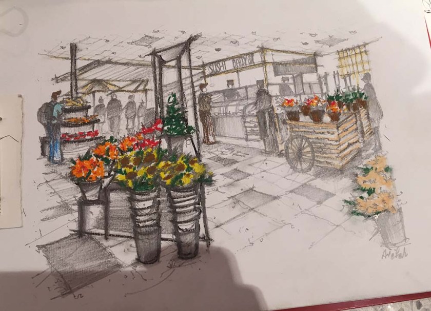 som är möjligt. På Hemköp City (under Åhléns City) fick vi tillstånd att sprida ut oss bland fiskdiskar, fruktstånd och tårtor så länge vi inte störde kunder och personal. Vilken härlig syn! Den som stod och tecknade framför rödlöken fick ideligen flytta på sig.