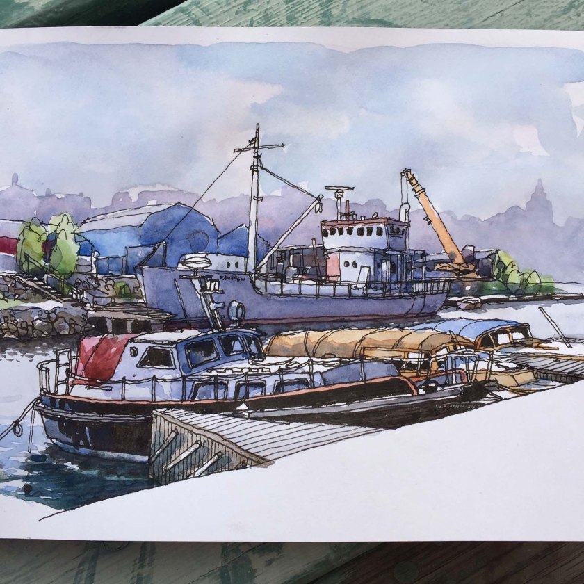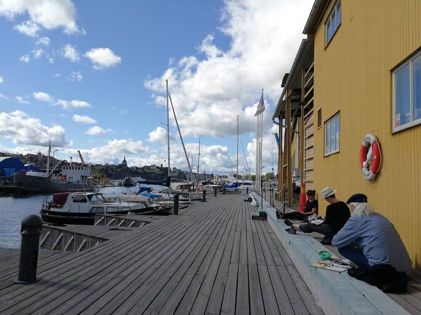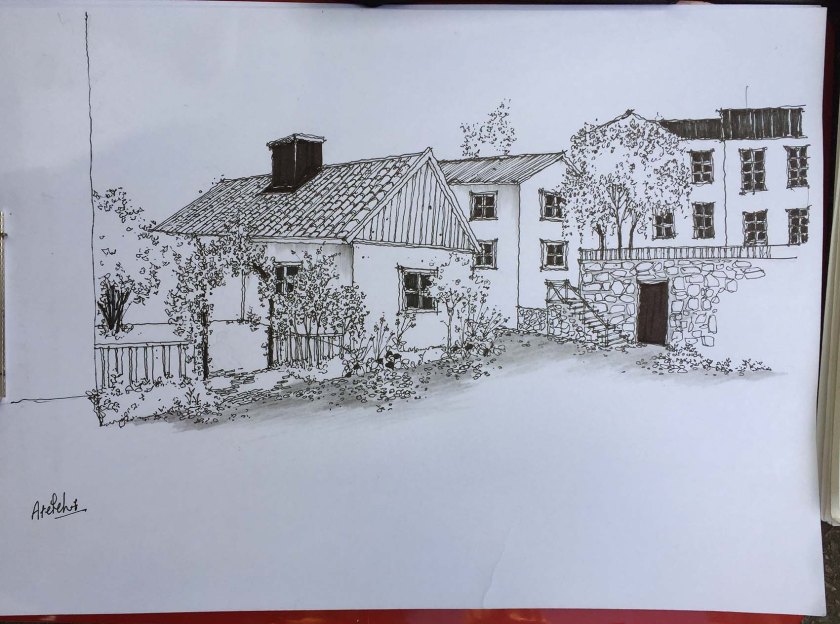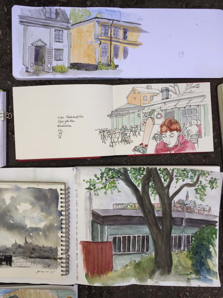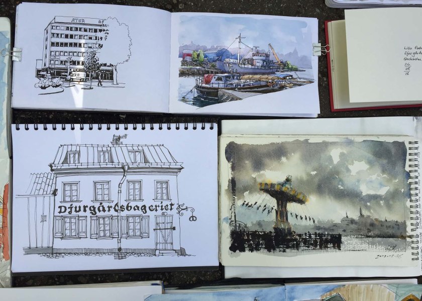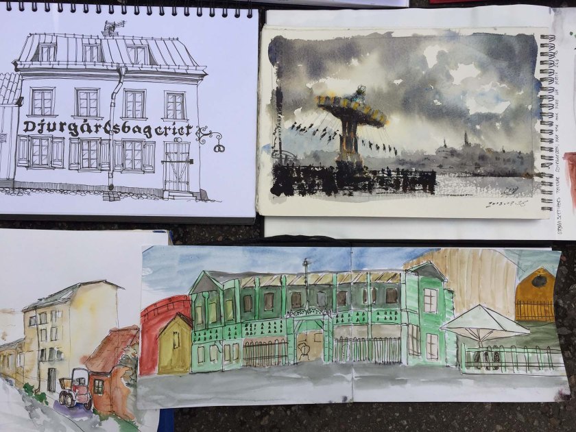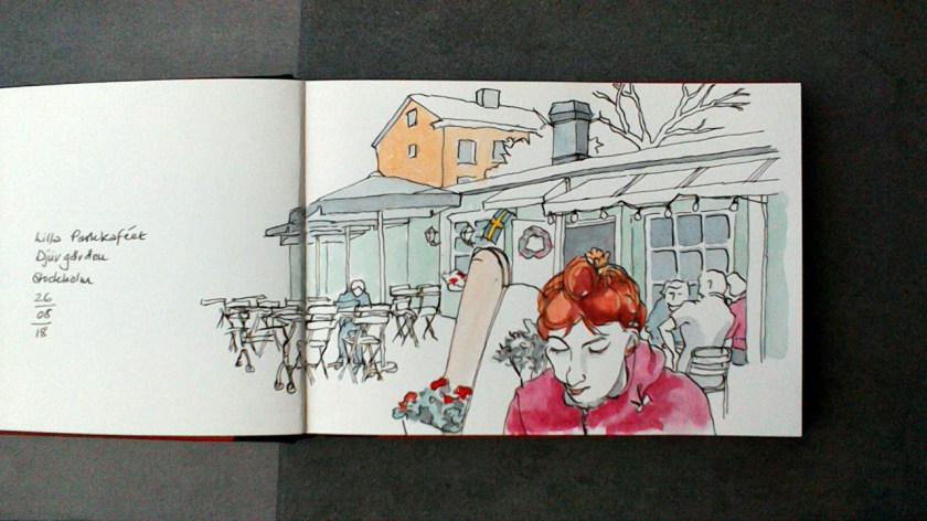 Djurgården är ju fullt av intressanta ställen att teckna, och det var som vanligt superintressant att se vilka motivval alla hade gjort. Vissa hade släntrat ner mot vattnet och båtarna, andra fastnade för de smala gränderna, en och annan tilltalades av caféet där vi fikade efteråt. Det här att se en plats genom någon annans ögon och hand är ju vad Urban sketchers går ut på – att visa världen en teckning i taget.