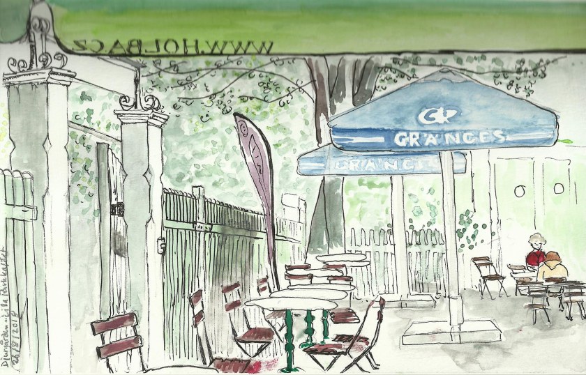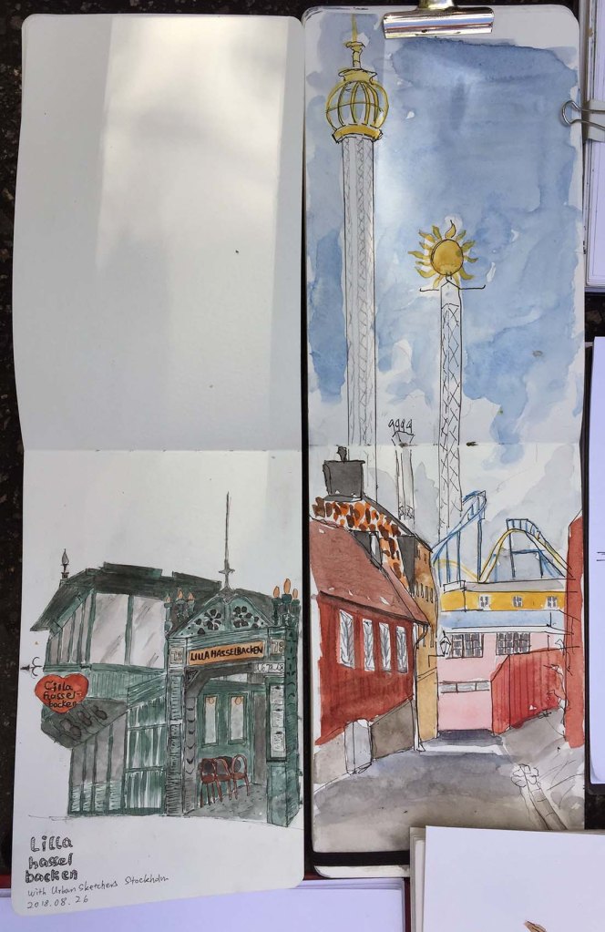 Nu har vi börjat teckna Stockholm igen efter ett VARMT sommaruppehåll. Den 26 augusti träffades vi på Djurgården, tecknade i två timmar, och sammanstrålade igen för att se varandras bilder och ta en fika.