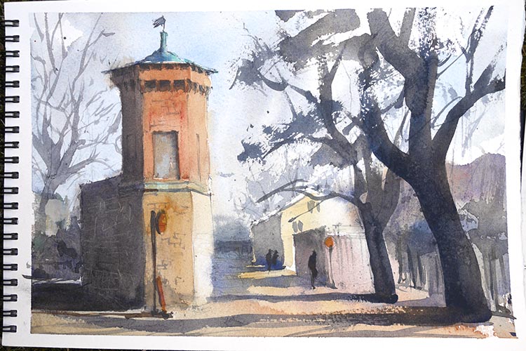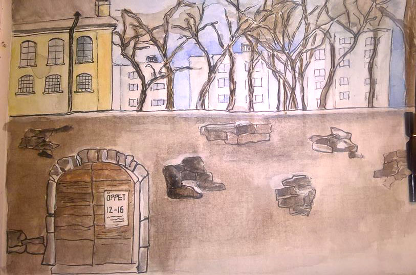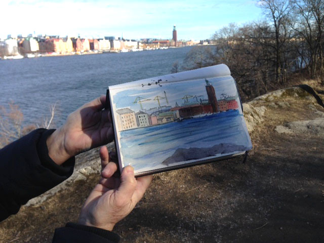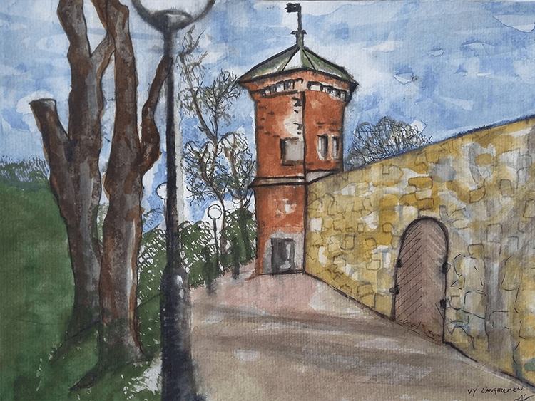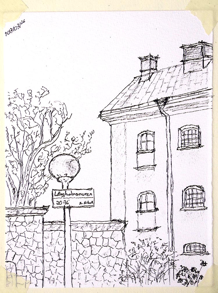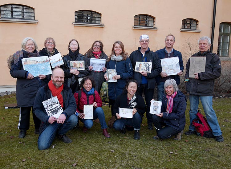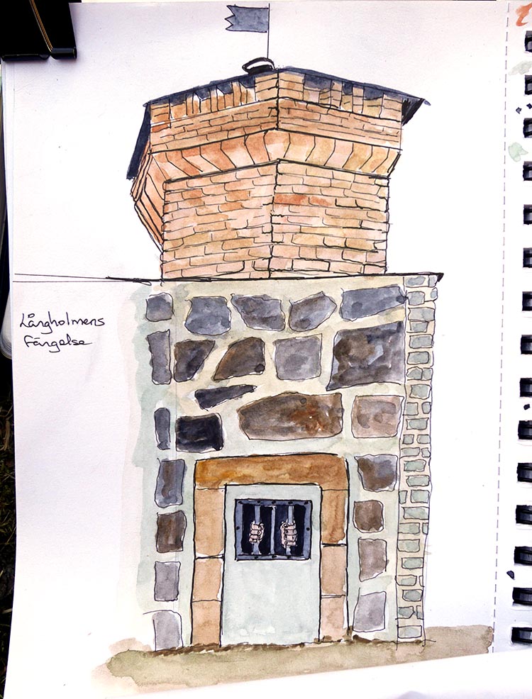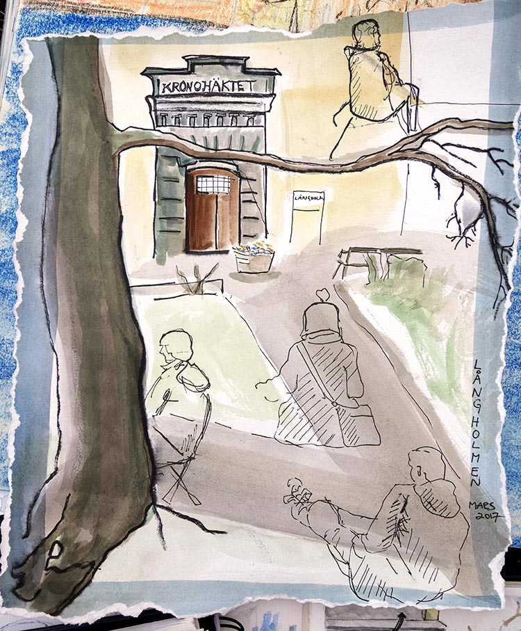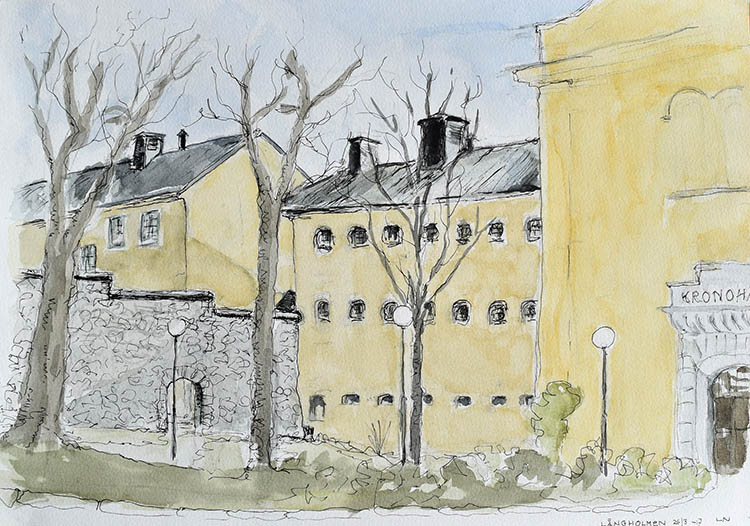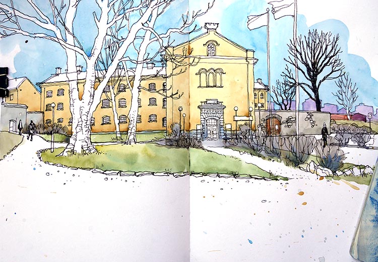 Den 26 mars samlades Urban sketchers Stockholm utanför Centralfängelset på Långholmen, för att teckna och njuta av den tidiga vårsolen. Lite blåsigt var det, men det gick fint att hitta platser i lä, så vi kunde hålla i ritverktygen utan vantar.