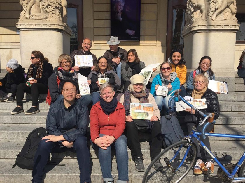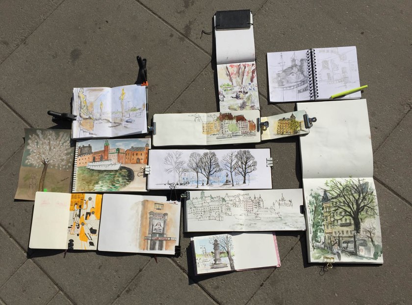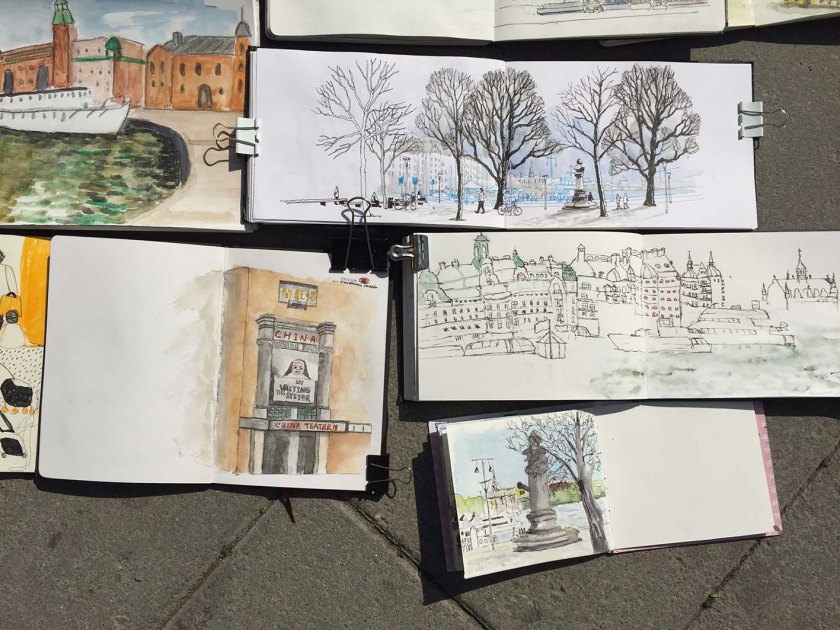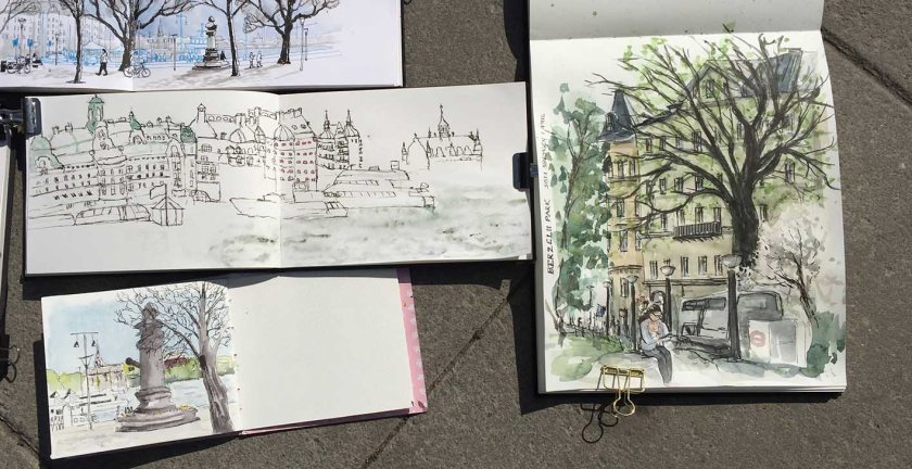Men Urban sketchers är ett tåligt släkte, vi tecknade i två timmar, sen sammanstrålade vi halvt djupfrystsa på Dramatens trappa – där det var lä och betydligt skönare – och tittade på allas bilder. Roligt att se, som vanligt. Det finns så många sätt att berätta om en plats!