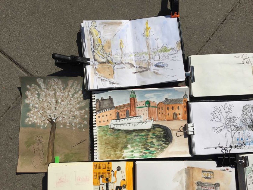 Vi firade in våren (trodde vi) med att teckna runt Nybroplan, men trots det fantastiska solskenet och gröna knoppar i alla träd kom en isande vind som fick oss alla att sitta och huttra medan vi tecknade. Det är april!