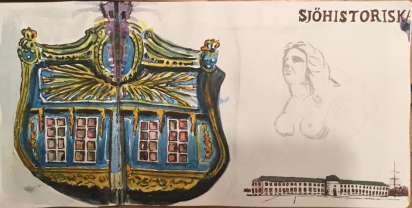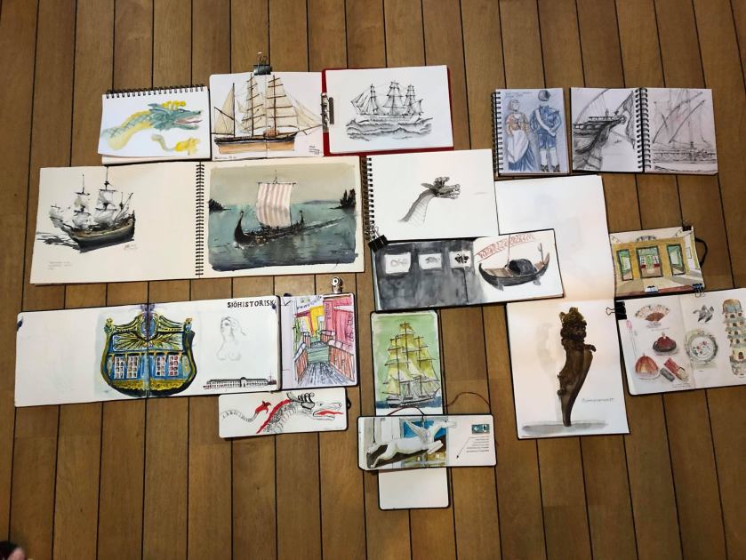 Sjöhistoriska erbjuder massor av vackra skeppsmodeller, roliga rum och hörn att sitta i och teckna, och efter en samling innanför entrén spred vi ut oss i hela muséet och tecknade av hjärtans lust. På slutet samlades vi och tittade på allas skisser – kul att se vad alla valt att lägga fokus på i sina bilder.