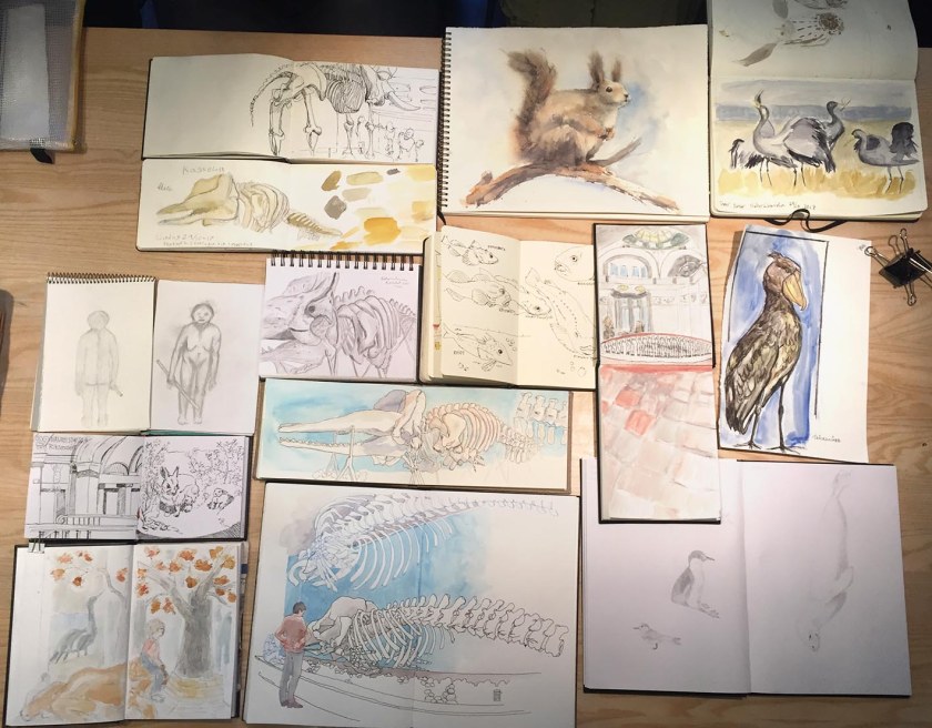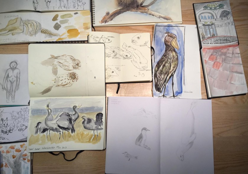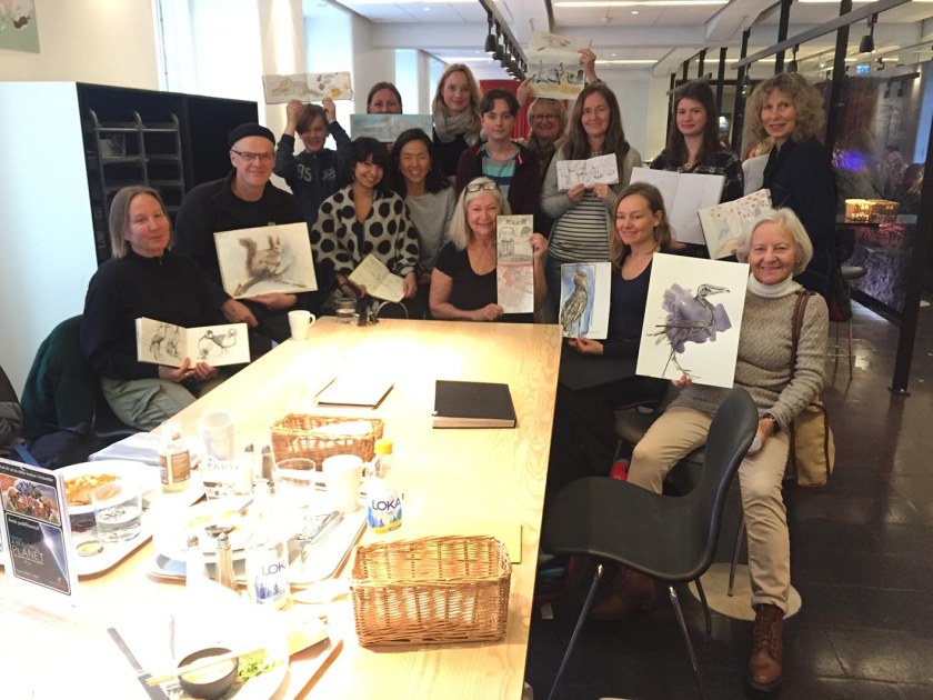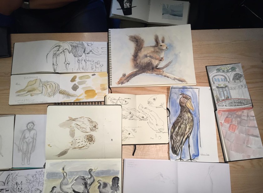 Efteråt sammanstrålade vi på ett av gallerians caféer och fikade och tittade på alla bilderna. Det är såklart frivilligt att visa sina skisser för övriga i gruppen, men de flesta gör det, t o m från första tillfället man är med. Det är ett av de roligaste momenten i det vi gör, att få se vad de andra gjort, jämföra, fråga, kommentera, peka, prova varandras pennor, känna på papperskvaliteten i skissböckerna…
