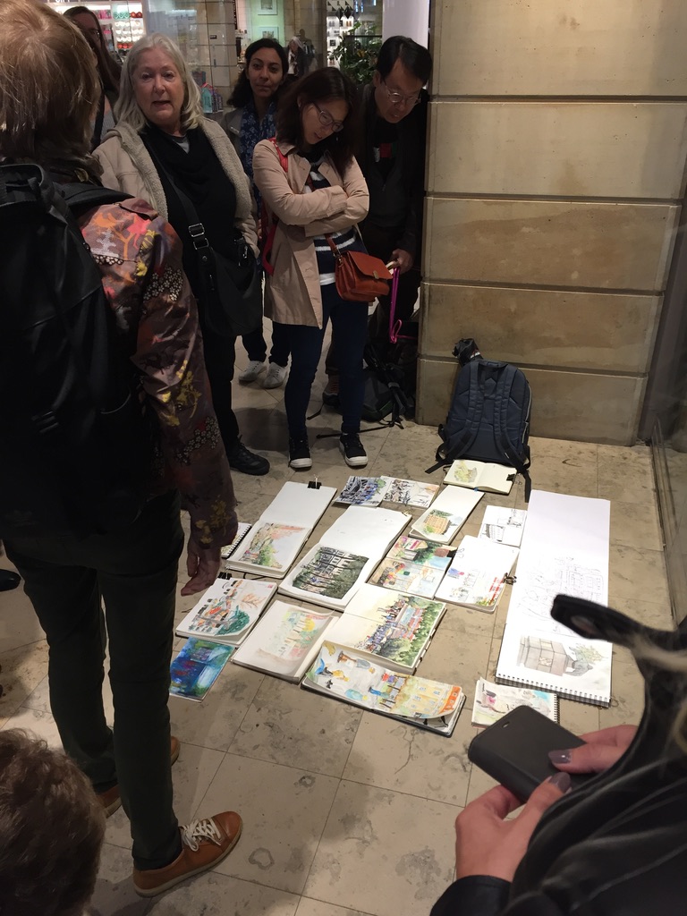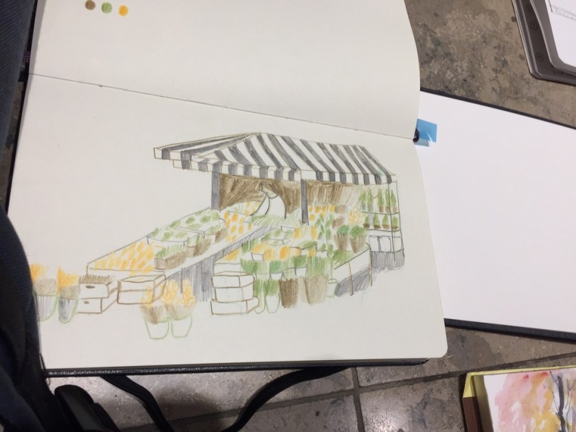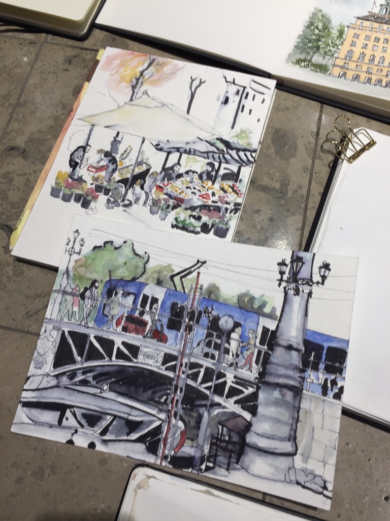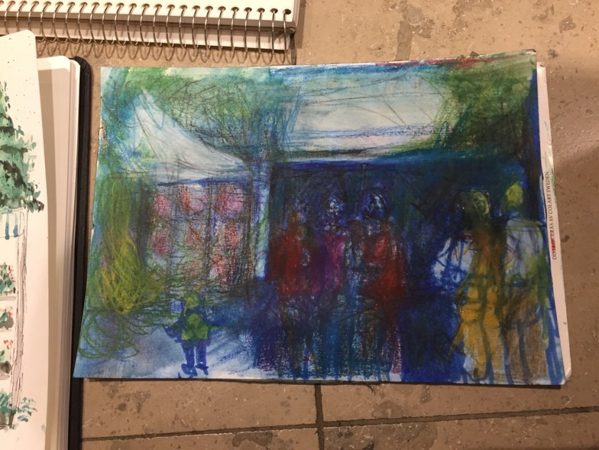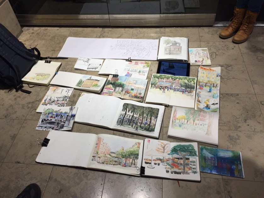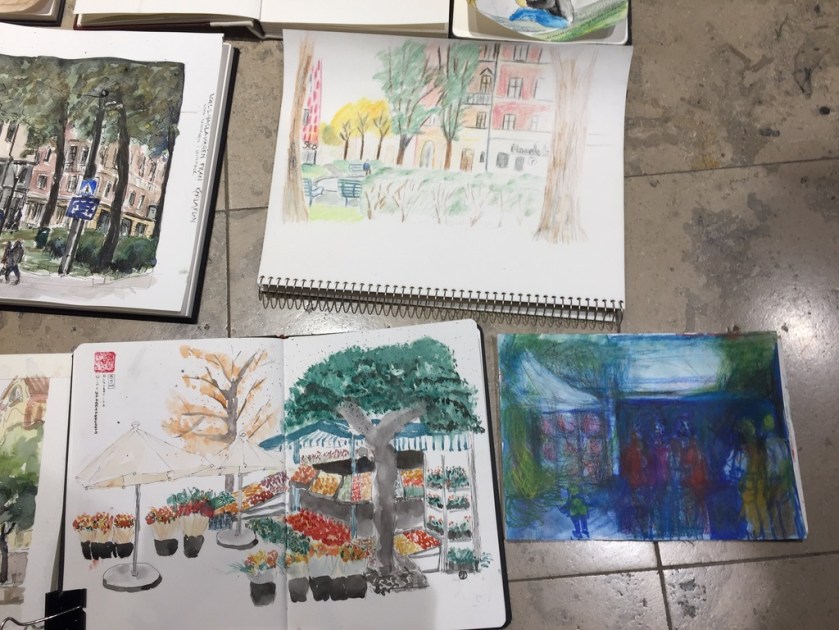 I slutet av varje skisstillfälle brukar vi lägga ut alla skissböcker och ritblock på golvet för att beskåda dagens arbete, ett härligt tillfälle att se bredden och möjligheterna till olika uttryck och tekniker, och skisserna från Hemköp var inget undantag. Det var en fröjd för ögat att se allas bilder! Så skiftande, och så mycket händelser skildrade, det här var en dag där alla mestadels hade ritat verb på teckningarna, inte bara substantiv. Folk som plockar varor, provar ost, handlar fisk – allt blev fångat på papper.