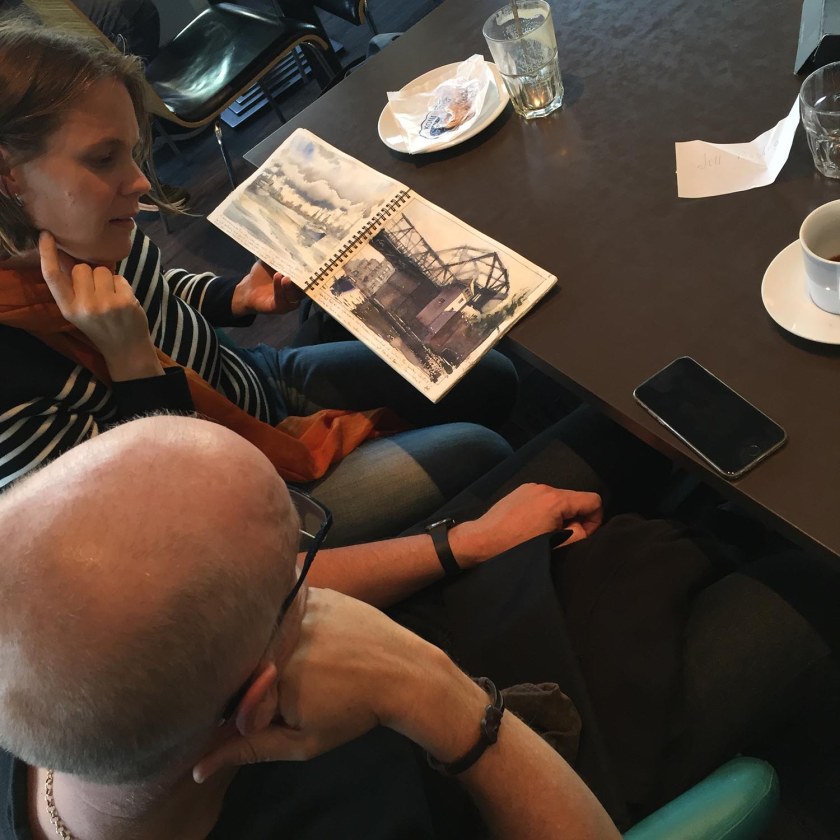 Fikastunden hölls på Pallas klassiska 50-talscafé med jämförelser av skisser och material. Flera nya skissare välkomnades i gruppen. Roligt att så många kom, trots avståndet till city!